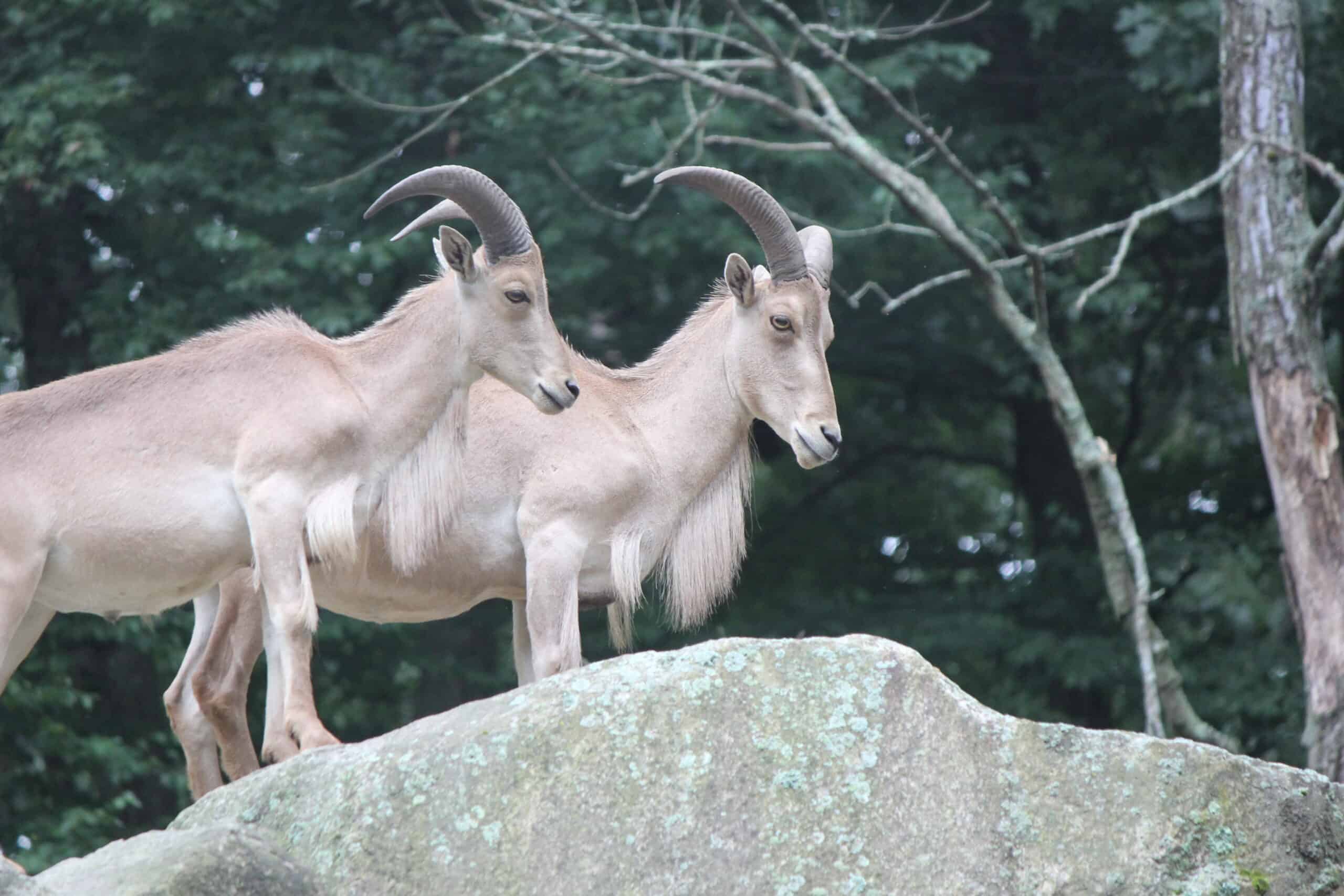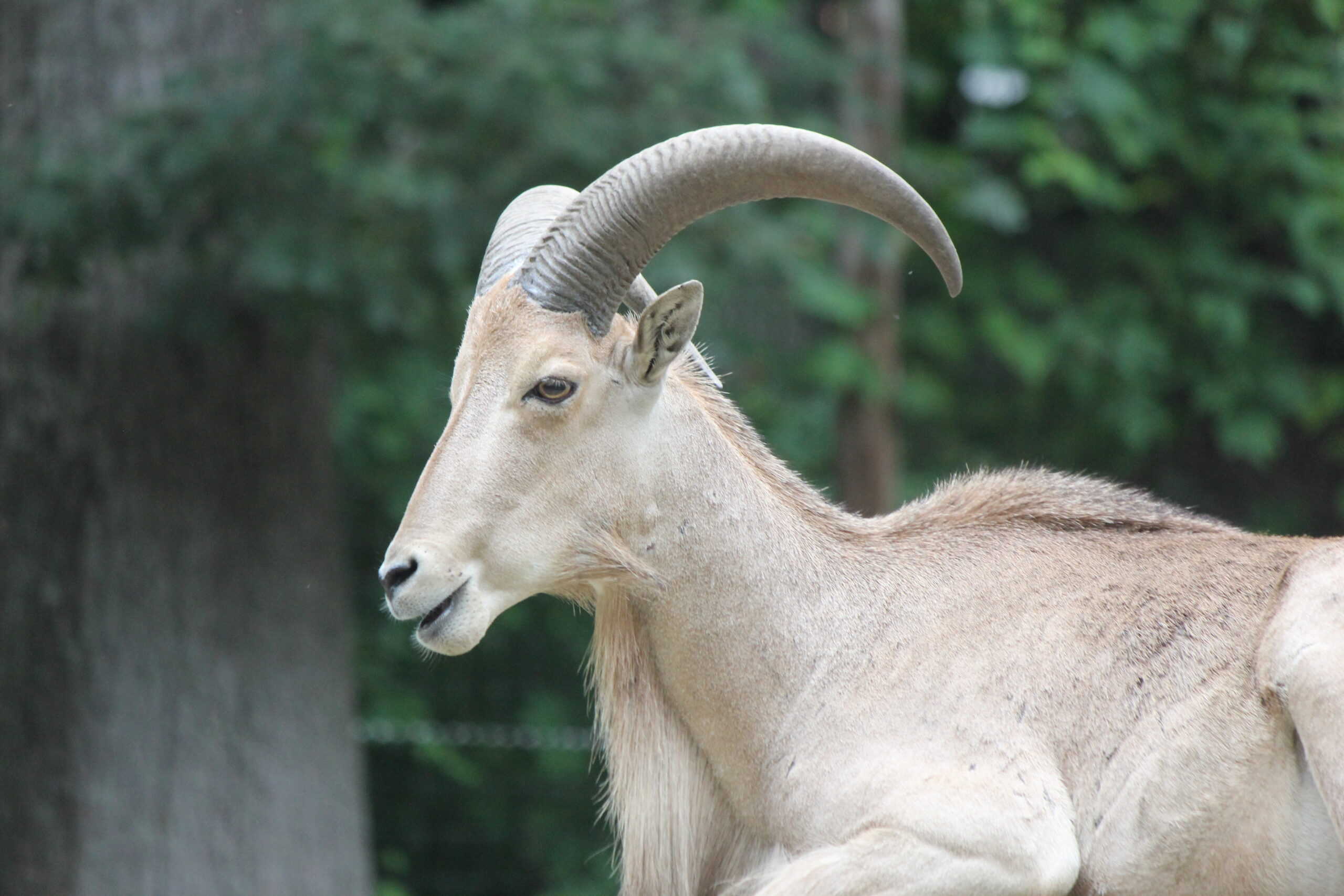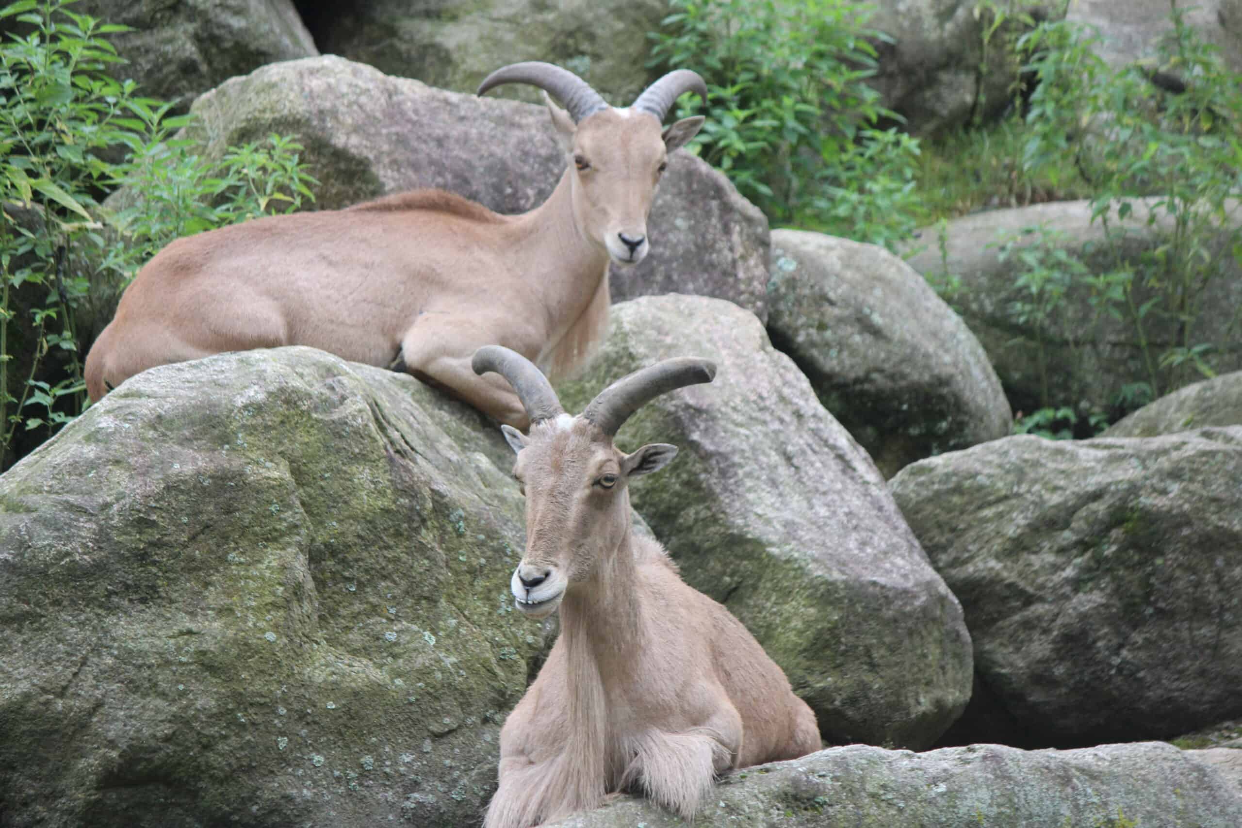 Aoudads have large, thick horns that curve backwards and may grow to be nearly 2 feet in length. Both male and female aoudads have horns.