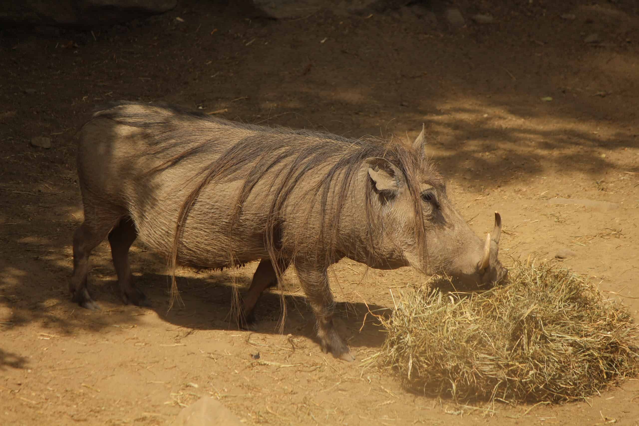 A warthog has two pairs of tusks that curve upwards. One longer pair protruding from their upper jaw and a shorter pair on the bottom. These tusks can be used for digging or self defense. The lower tusks can inflict deep wounds.