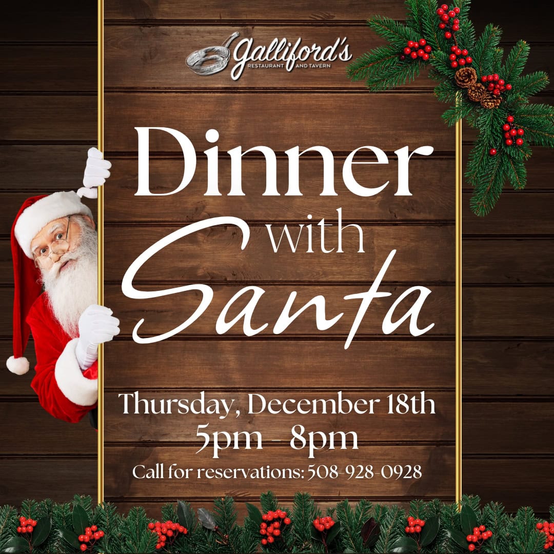 Ho ho ho, another magical night is here! 🎅✨Join us for a cozy, jolly Dinner with Santa at Galliford's Restaurant & Tavern on Dec. 18, 5–8 PM. Call 508-928-0928 to book!