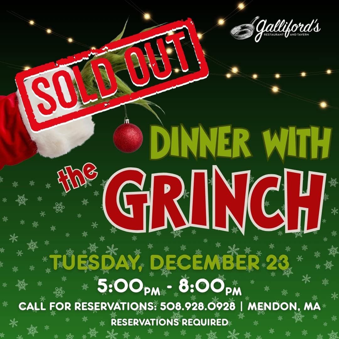 He’s green, he’s grumpy, and he’s coming to dinner! Join us for Dinner with the Grinch and embrace the (not-so) merry side of the holidays. We can’t promise smiles... but we can promise laughs!Dec. 3, 10 & 17 | 5–8 PM (SOLD OUT)Galliford’s Restaurant & TavernCall 508-928-0928 to save your seat... before he steals it!